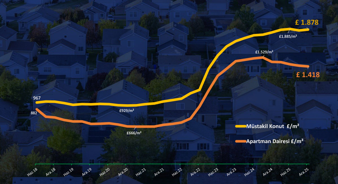“101evler Emlak Sitesi’nde yer alan verilere göre, Aralık 2025 sonunda apartman dairelerinin ortalama metrekare satış fiyatı bin 418 (1.418) sterlin düzeyinde. Bu miktar, 12 Şubat tarihli serbest piyasa kurlarıyla 84 bin 726 TL’ye karşılık geliyor. Villaların ortalama metrekare fiyatı ise bin 878 (1.878) sterlin olarak belirlenirken, bu miktar da 112 bin 211 TL’ye denk geliyor. Aralık 2025 itibarıyla 75 metrekarelik ortalama bir apartman dairesinin fiyatı 106 bin 350 sterlin (6,3 milyon TL); 150 metrekarelik bir villanın fiyatı da 281 bin sterlin (16,8 milyon TL) civarında hesaplandı.