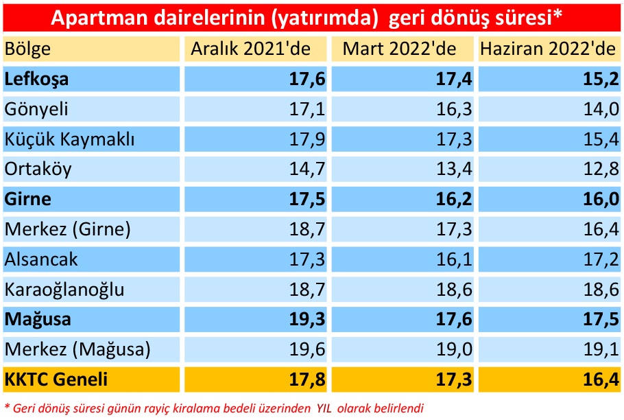 İlçeler içinde dairelerin yatırım karşılığını verme süresinde Lefkoşa ön plana çıkarken, Lefkoşa’nın geri dönüş süresi ortalama 15.2 yıla indi. Girne’nin geri dönüş süresi ortalama 16 yıl, Mağusa’nın geri dönüş süresi de ortalama 17.5 yıl düzeyinde hesaplandı. İlçelerin semtlerine göre en kısa geri dönüş süresi Lefkoşa’ya bağlı Ortaköy oldu. Ortaköy’de alınan bir dairenin geri dönüş süresi 12.8 yıla indi. Gönyeli 14 yılla ikinci, Küçük Kaymaklı da 15.4 yılla üçüncü sırada yer aldı. Ülke çapında semtlere göre en uzun geri dönüş süresi olan yer ise 19.1 yılla Mağusa Merkez oldu. Bu semti 18.6 yılla Karaoğlanoğlu ile 17.2 yılla Alsancak takip etti.