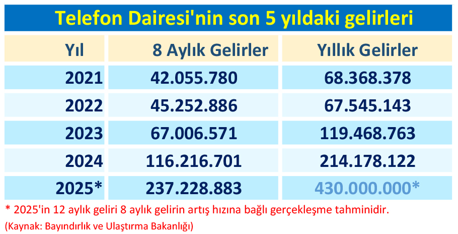 Bayındırlık ve Ulaştırma Bakanlığı’na bağlı dairenin gelirleriyle ilgili yaptığımız araştırmada, telekomünikasyon organizasyonunun ülkeye çok ciddi gelirler sağladığı ortaya çıktı. Devletin resmi verilerine göre 2025 yılının Ocak-Ağustos ayları arasında “Telefon Dairesi’nin” elde ettiği gelir 237 milyon 228 bin Türk Lirası’nın üzerinde. 2025 yıl sonu gelirinin ise sekiz aylık gelirin artış hızına bağlı olarak 430 milyon lirayı geçmesi bekleniyor.