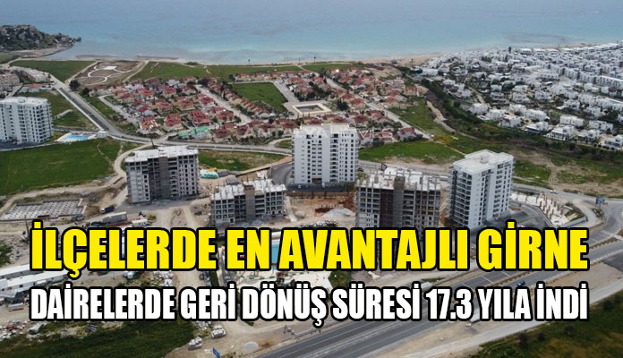 İLÇELERDE EN AVANTAJLI GİRNE… Apartman dairelerinin geri dönüş süresi en kısa olan ilçe ortalama 16.2 yılla Girne olurken, Lefkoşa’nın geri dönüş süresi ortalama 17.4 yıl, Mağusa’nın geri dönüş süresi de ortalama 17.6 yıl düzeyinde hesaplandı. Lefkoşa, Mağusa ve Girne ilçelerinin semtlere göre en kısa geri dönüş süresi Lefkoşa’ya bağlı Ortaköy’de ortaya çıktı. Ortaköy’de alınan bir dairenin geri dönüş süresi 13.4 yıl. Alsancak 16.1 yılla ikinci, Gönyeli de 16.3 yılla üçüncü sırada yer alıyor. Ülke çapında semtlere göre en uzun geri dönüş süresi olan yer ise 19 yılla Mağusa Merkez oldu. Bu semti 18.6 yılla Karaoğlanoğlu ile 17.3 yılla Girne Merkez ile Küçük Kaymaklı takip ediyor.