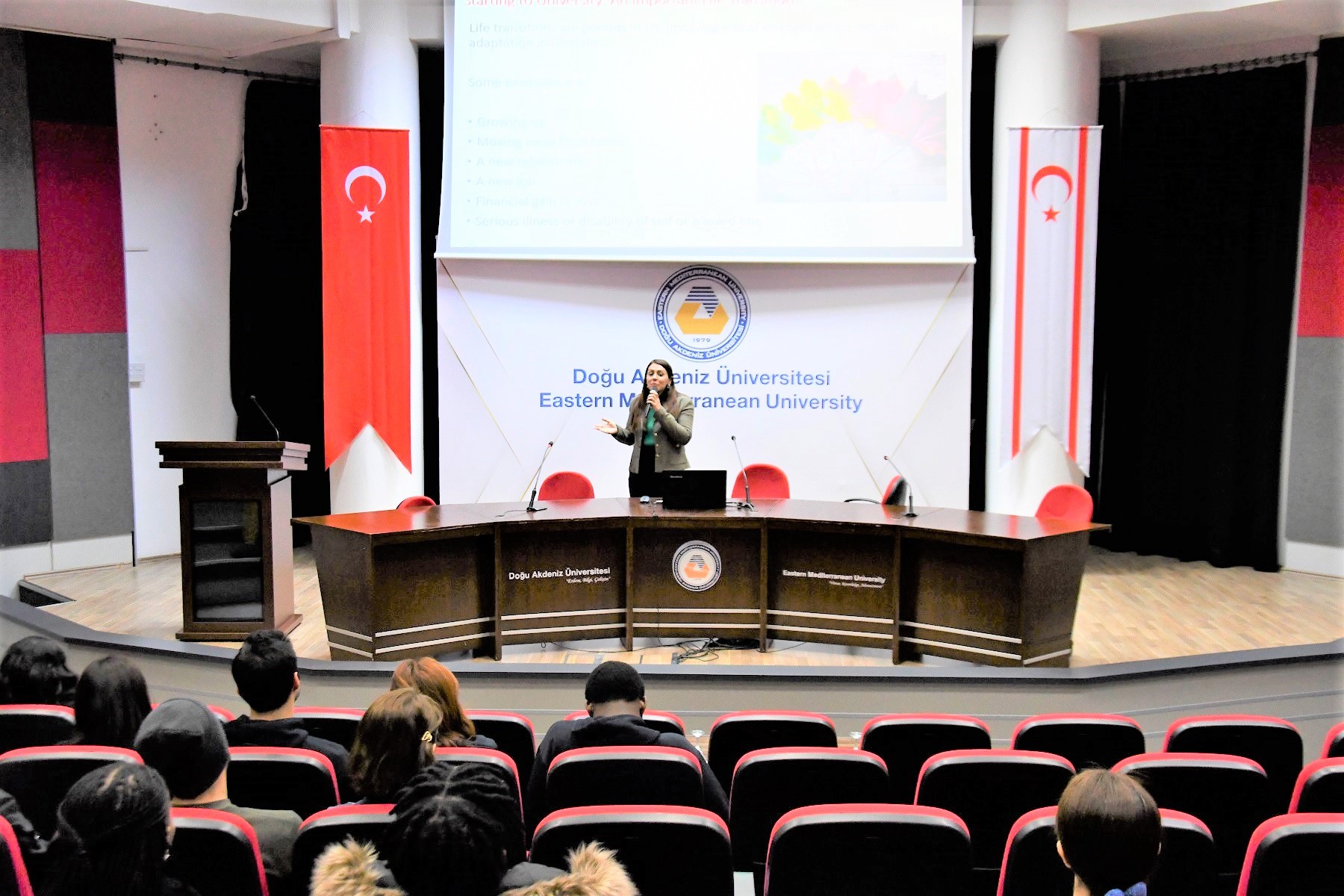 23 Şubat 2023 Perşembe günü, saat 14:00’te, DAÜ Mustafa Afşin Ersoy Salonu’nda Polis Genel Müdürlüğü ve DAÜ Güvenlik İşleri Şube Amirliği tarafından yeni öğrencilere, KKTC’de muhaceret, ceza ve trafik kuralları ile ilgili bilgi aktarmak amacıyla “KKTC’de Güvenlik Semineri” verildi. Bu seminerin ardından ise yine aynı salonda saat 15:00’te DAÜ Psikolojik Danışmanlık, Rehberlik ve Araştırma Merkezi (DAÜ-PDRAM) tarafından “Üniversite Yaşamına Uyum: Güçlükleri Fırsata Dönüştürmek” konulu seminer gerçekleştirildi. Bu seminerde, DAÜ Sağlık Merkezi tarafından da öğrencilere Sağlık Merkezi’nin ücretsiz olarak sunduğu hizmetler konusunda bilgilendirme yapıldı.