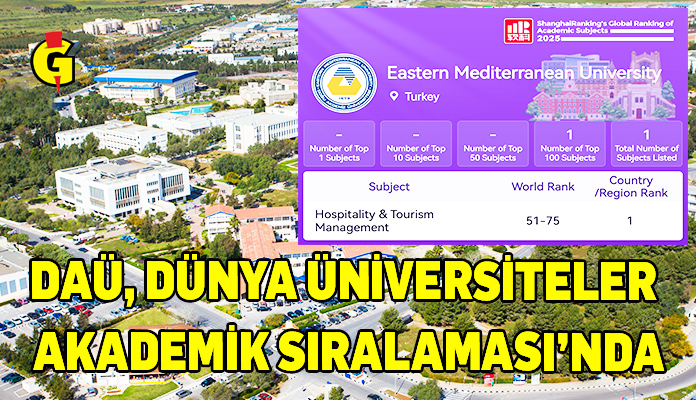 Doğu Akdeniz Üniversitesi (DAÜ), Çin merkezli Shanghai Ranking tarafından açıklanan 2025 yılı Dünya Üniversiteler Akademik Sıralaması’nda  Ağırlama ve Turizm Yönetimi alanında dünyada 51-75 bandında yer alırken, “Araştırma Etkisi” kategorisinde ise 20 üzerinden 18,2 puan alarak dünya 12. oldu.
