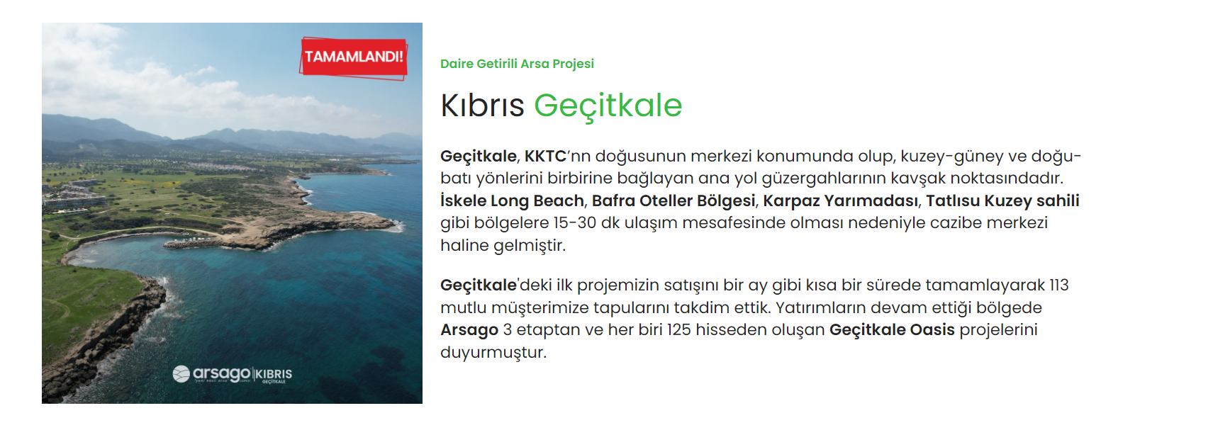 İskele-Karpaz Gazetesi’nin yaptığı detaylı araştırmalar neticesinde, İstanbul merkezli ‘Arsago’ isimli firmanın geçmişte Geçitkale’deki ilk projesinin büyük ilgi gördüğü iddia edilirken, 25 arsa payından oluşan ve kısa sürede satışları tamamlanan Kıbrıs Geçitkale Oasis projesinin 2’nci etap satışlarının devam ettiği de öne sürüldü. Emlak sektörünün deneyimli isimleri; yatırımcılara, ‘deniz manzaralı’, ‘denize yakın’ gibi ifadelerle yüksek fiyattan pazarlanarak satılan projelerin, günün sonunda gerçek ortaya çıktığı zaman yatırımcıları zarar ettirebileceği uyarısında bulundu.