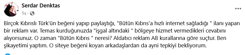 Demokrat Parti (DP) eski Başkanı Serdar Denktaş, sosyal medyada birçok Kıbrıslı Türk’ün beğeni yapıp, paylaştığı “Bütün Kıbrıs’a hızlı internet sağladığı ” ilanı yapan bir reklam olduğunu, ancak temas kurulduğunda “işgal altındaki” bölgeye hizmet verilmediği cevabı alınan şirketin protesto edilmesi çağrısı yaptı. Kişisel sosyal medya hesabından çağrıda bulunan Denktaş, “Bütün Kıbrıs ” neresi? Aldatıcı reklam AB kurallarına göre suçtur. Ben şikayetimi yaptım. O siteye beğeni koyan arkadaşlardan da ayni tepkiyi bekliyorum” dedi.