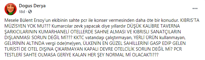 Cumhuriyetçi Türk Partisi (CTP) Milletvekili Doğuş Derya, konuyla ilgili olarak sosyal medya üzerinde bir açıklama yaparak, “Mesele Bülent Ersoy’un ekibinin sahte PCR ile konser vermesinden daha öte bir konudur” dedi.