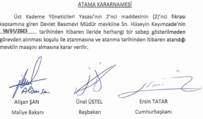 Devlet Basımevi Müdürlüğü’ne Hüseyin Kayımzade atandı. Karar resmi gazetede yayınlandı.