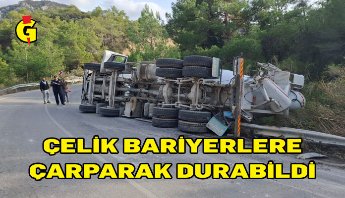 Polisten yapılan açıklamaya göre, yolun sağında bulunan trafik levhası ile çelik bariyerlere çarparak durabilen beton mikseri, sağ yan kısmı üzerine devrildi.