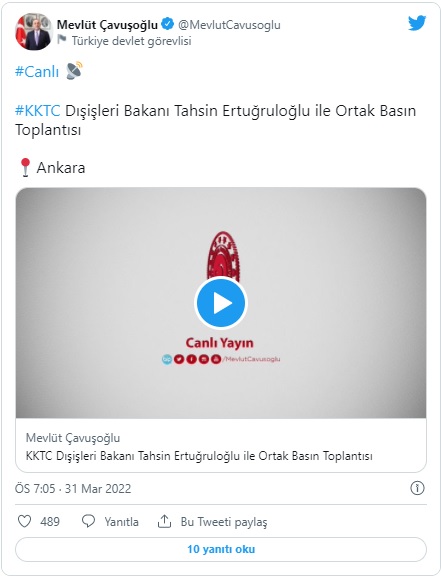 Türkiye Dışişleri Bakanı Çavuşoğlu ise Bakan Ertuğruloğlu ile Kıbrıs meselesini, Doğu Akdeniz’i ve Maraş’ı değerlendirdiklerini ve vizyonlarını teyit ettiklerini belirterek “Kıbrıs’ta bir çözüm aranıyorsa Kıbrıs Türk halkının egemen eşitliğinin ve eşit egemen statüsünün tescil edilmesi şart” dedi.