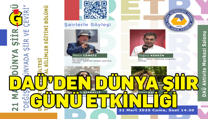 DAÜ Kampüsünde yer alan Sosyal ve Kültürel Aktiviteler Müdürlüğü, Aktivite Salonu’nda 21 Mart 2025 Cuma günü gerçekleşecek olan etkinliklerde ilk olarak saat 14.30’da Emel Kaya moderatörlüğünde Metin Cengiz, Tuğrul Keskin ve Maria Siakalli’nin katılacağı “Değişen Dünyada Şiir ve Çeviri” konulu söyleşi var. Saat 17.00’de ise Atakan Sarı ve Mustafa Fegan’ın sunacağı müzik dinletisiyle şairlerin şiir şöleni başlayacak.