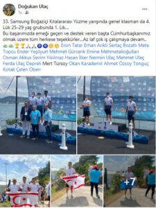 Yüzmeci Doğukan Ulaç, sosyal medya hesabından yaptığı paylaşım ile 33. Samsung Boğaziçi Kıtalararası Yüzme Yarışı’nda Genel Klasman’da dördüncülük ve 25-29 yaş grupları arasında ise birincilik kazandığını duyurdu.