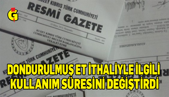 Tüzük’te, “dondurulmuş ithal etin 8 ayı doldurmamış olacak şekilde ülkeye sokulabileceği kuralı”, “Ancak ithal edilen besin maddesinin dondurulmuş et ise en iyi kullanım süresinin 1/2’sini doldurmamış olacak şekilde Kuzey Kıbrıs Türk Cumhuriyeti’ne sokulmaları gerekmektedir.” şeklinde değiştirildi.