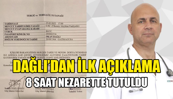 KKTC’ye dönmesinin ardından sosyal medya üzerinden bir açıklama yapan Dağlı, 8 saat boyunza nezarette kaldığını dile getirerek, şunları söyledi:
