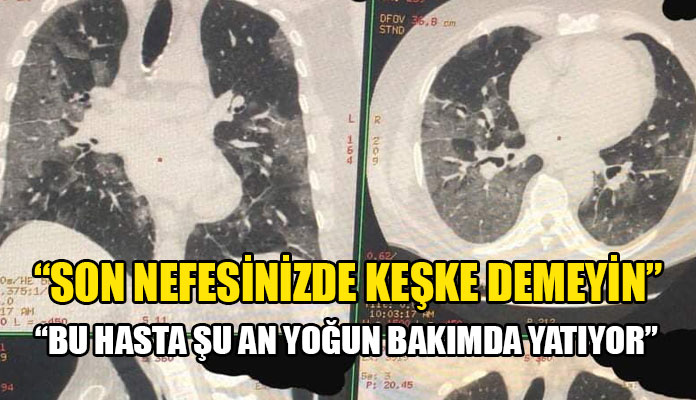 “Aşısız bir hastamızın COVID-19 enfeksiyonu esnasında akciğerlerinin durumu . Hastamız aşının yan etkilerinden korktuğu ve aşı ile ilgili yapılan spekülatif haberlerden etkilendiği için aşı olmamış ; hastalık belirtileri ortaya çıktığı zaman da , tedavide kullanılan ilaçlar verilir de zarar görür endişesi ile hastaneye erken başvurmamış . Şuan yoğun bakımda yatıyor . Maalesef hastamız baştan beri korkması gerekenin aşı veya tedavide kullanılan ilaçlar değil COVID-19 enfeksiyonu olduğunu biraz geç anlamış oldu .