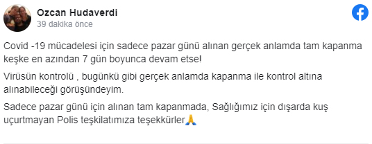 Girne Akçiçek Hastanesi’nde görev yapan Dr. Özcan Hüdaverdi, sosyal medya üzerinden paylaşım yaparak, “Koronavirüs mücadelesi için sadece Pazar günü alınan gerçek anlamda tam kapanma keşke en azından 7 gün boyunca devam etse!” ifadelerini kullandı.