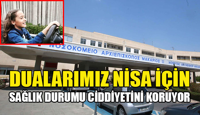 MAKARIOS HASTANESİ DOKTORLARI SEFERBER OLDU… Pazar akşamından beridir yoğun bakımda uyutulan Nisa’nın sağlık durumundan endişe eden ailesinin isteğiyle, dün saat 13.00 sıralarında İki Toplumlu Sağlık Teknik Komitesi’nin girişimleri neticesinde, Güney Lefkoşa’daki Makarios Hastanesi’ne sevk edildi. Nisa’nın sağlık durumuyla ilgili açıklamalarda bulunan Makarios Hastanesi İcra Direktörü Andreas Neophytou, talihsiz çocuğun yoğun bakım ünitesinde tedavi altına alındığını ifade ederek, sağlık durumunun son derece ciddi olduğunu vurguladı. Öte yandan Hastanenin Pediatri Servisi Şefi Dr. Avraam Elia ise yaptığı açıklamada, küçük kızın sağlık durumunun kritik olduğunu belirterek, hastanenin tüm doktor ve hemşirelerinin Nisa için seferber olduğunu ifade etti.
