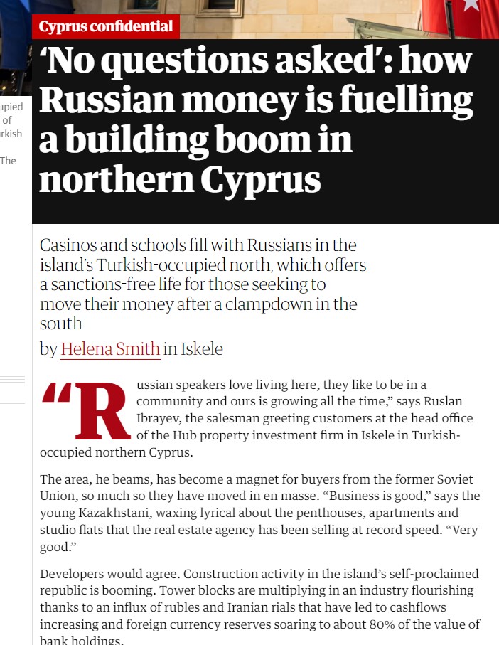 Guardian, bir Ukraynalı’nın “Burada çok sayıda Rus var ve evet ben Ukraynalıyım ama hepimiz burayı seviyoruz. Kara parayı harcamak istiyorsun, soru sorulmuyor. Ev almak istiyorsunuz soru sorulmuyor. Bankaların sürekli ‘bunu nereden aldın, şunu nereden aldın?’ diye sorduğu Londra gibi değil” dediğini aktardı. Haberde, Rus oligarkların İskele bölgesine “yeni Limasol” adını verdiği anlatılırken, bölge “Bir zamanlar sıradan bir kasaba olan İskele, şimdiler demir ve ağır beton altında kalıyor. Kiril alfabesiyle yazılmış mağaza tabelaları, ‘rüya hayatı’ vaat eden reklam panoları, lüks otomobil bayileri ve kripto para mağazalarıyla dolu” ifadeleriyle tanımlandı.