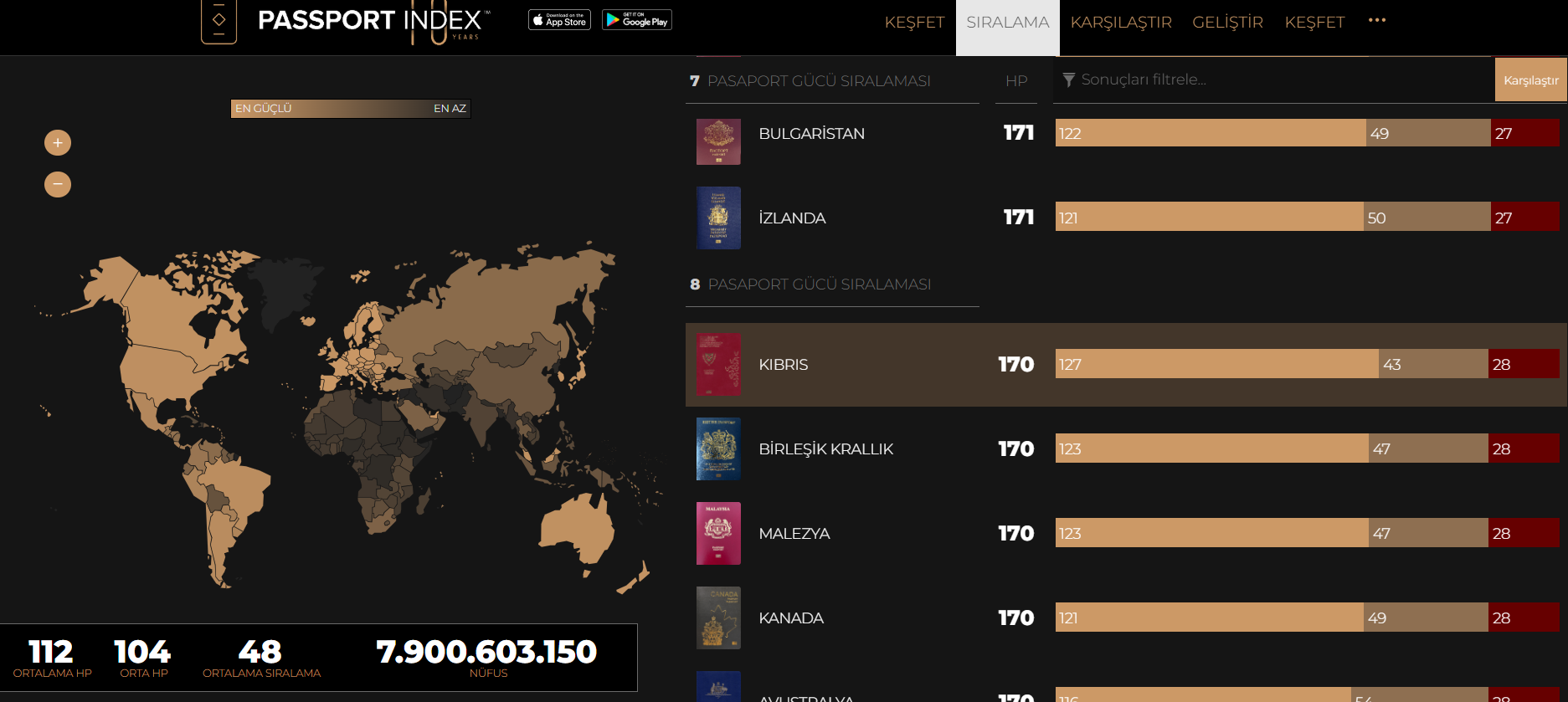 Kıbrıs pasaportu “Pasaport İndex” sıralamasına göre 8. sıradadır. Kıbrıs pasaportu sahipleri, 170 ülkeye vizesiz giriş yapabilirken 28 ülke için vizeye sahip olmaları gerekmektedir.
