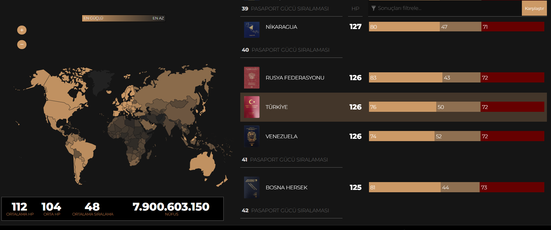 | Ülke | Vizesiz | Varışta Vize / e-Visa | Vize Gerekli | Toplam HP |