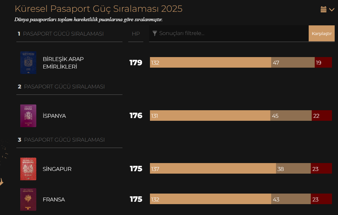 “Küresel Pasaport Güç Sıralaması 2025” listesine göre bu sıralama bulunduğunuz ülkeden vize almadan ya da vize ile uçabileceğiniz şehirlere göre belirleniyor. Sıralamada ilk olarak Birleşik Arap Emirlikleri yer alırken, ikinci sırada İspanya ve üçüncü sırada Singapur, Fransa yer alıyor.