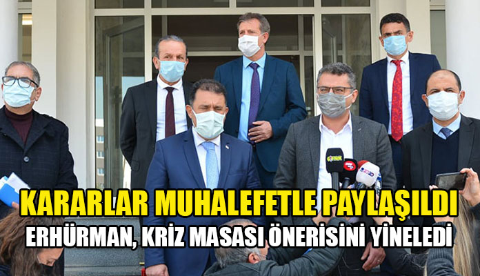 CTP Genel Başkanı Tufan Erhürman, hükümetin yaptığı çalışmalarla ilgili muhalefete bilgi verildiğini söyledi. Aktarılan verilerle ilgili görüş alışverişinde bulunulduğunu anlatan Erhürman konunun yetkili organlarda değerlendirileceğini ifade etti. Karar alma noktasında etkin olmasa bile karar alınmadan önce konuların tartışılması ve görüş alışverişinde bulunulması için sürecin En başından beridir kriz masasını savunduklarını dile getirdi.