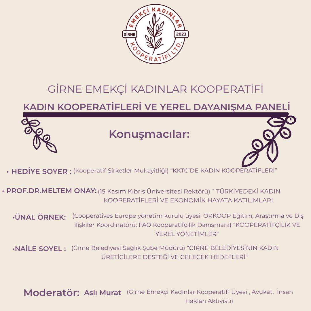 Moderatörlüğünü Girne Emekçi Kadınlar Kooperatifi üyesi avukat Aslı Murat’ın yapacağı etkinlik, kadınların ekonomik hayata katılımı ve kooperatifçilik üzerine önemli bir platform sunacak.