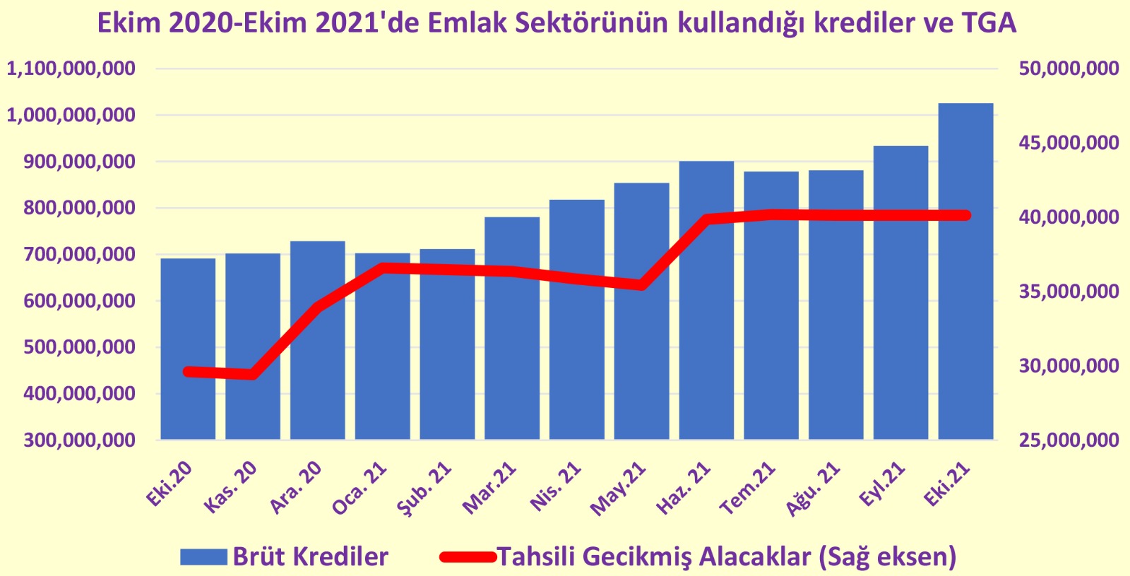 ÖDENEMEYEN BORÇLAR 40,1 MİLYONDA KALDI… Merkez Bankası Risk Merkezi verilerine göre emlak sektörünün tahsili gecikmiş alacakları (TGA) da Ekim 2020-Ekim 2021 periyodunda %35.55 oranında artış gösterdi. Temmuz ayında 40,1 milyon seviyesine ulaşan TGA, Ağustos, Eylül ve Ekim aylarını aynı seviyede geçti. Temmuz’a 40 milyon 180 bin TL ile sektörde tüm zamanlarda görülen en yüksek miktara ulaşan TGA Ekim itibarıyla 40 milyon 128 bin seviyesinde. Sektörün sorunlu borçları Eylül 2020’de 13 milyon 910 bin TL düzeyinde saptanırken, Temmuz 2021’e kadarki süreçte çok hızlı arttığı da izlendi.