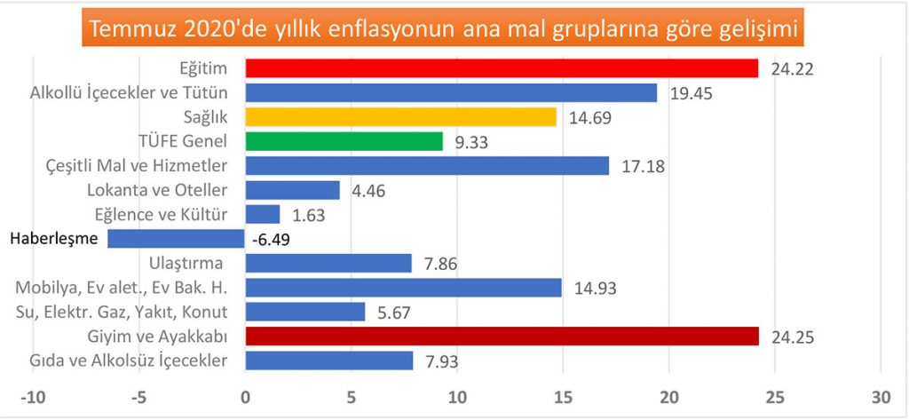 Temmuz 2020 Tüketici Fiyat Endeksi’ni (TÜFE) açıklayan İstatistik Kurumu, bir önceki yılın Aralık ayına kıyasla (2020’nin 7 ayı) enflasyonun % 6.44 oranına yükseldiğini bildirirken, yıllık (Temmuz 2019-Temmuz 2020) enflasyonun da %9.33 oranına çıktığını açıkladı.