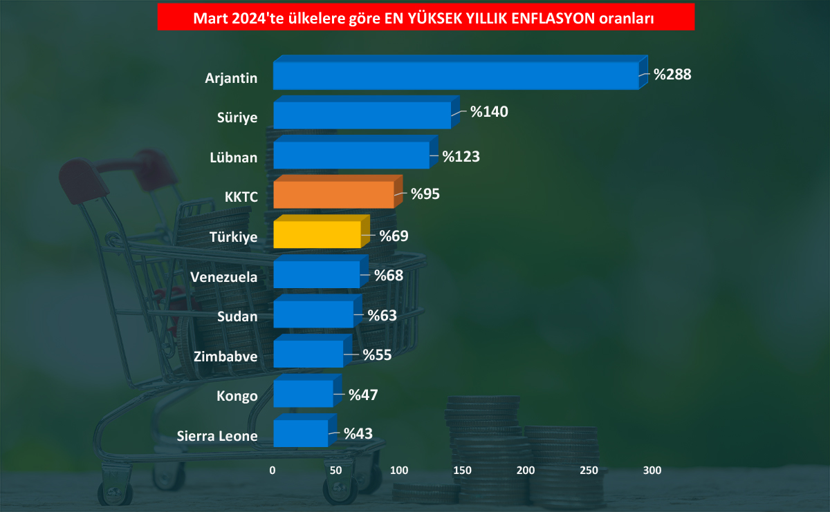 KKTC’de Mart ayında yıllık enflasyon %94.45; Türkiye’de ise %68.5 oldu. Bu oranlar KKTC’yi “dünya 4’üncüsü; Türkiye’yi ise dünya 5’incisi” yapıyor. Gerek KKTC’nin gerekse TC’nin tüketici enflasyonunda (TÜFE) tüm Afrika ülkelerinden daha kötü durumda olduğu dikkati çekti. Trading Economics sitesinin Mart 2024 veya buna en yakın tarihi içeren verileri sadece 7 ülkede enflasyonun %50’den yüksek olduğunu gösteriyor. Trading Economics, KKTC’yi listeye dahil etmezken, GIYNIK İstatistik Kurumu’nun resmi verileri kullanarak, ülkenin sıralamadaki yerini belirledi.