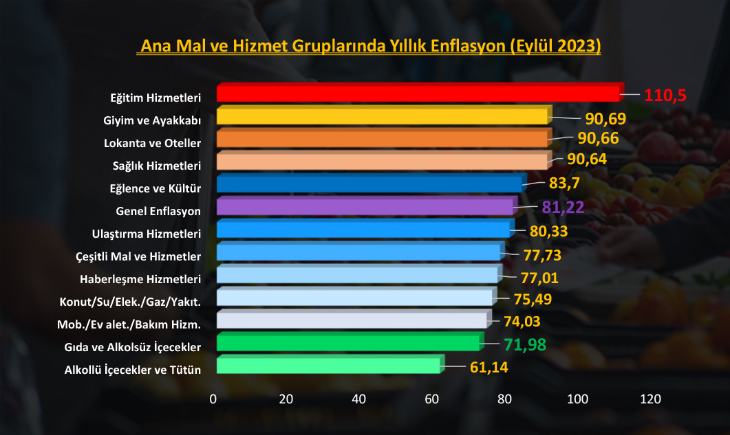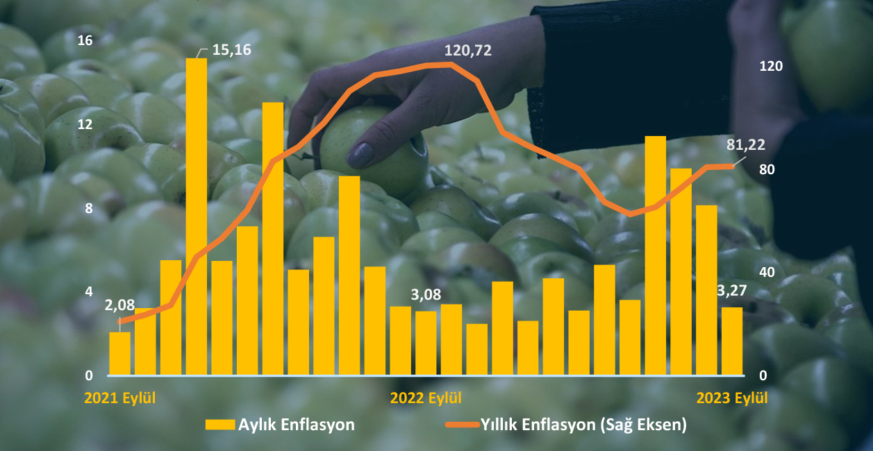 İstatistik Kurumu Eylül ayı verilerine göre 2023 yılında 9 aylık hayat pahalılığı %63.64 olurken; yıllık enflasyon ise %81.22 olarak gerçekleşti. Bir önceki aya göre, endekste kapsanan 518 maddenin ortalama fiyatlarında artış, 87 maddenin ortalama fiyatlarında ise düşüş gerçekleşti. En yüksek fiyat artışı gösteren ilk üç mal; %157.3 ile kırmızı lahana, %93.6 ile beyaz lahana ve %87.5 ile halı saha kiralama ücreti oldu. En yüksek fiyat düşüşü gösteren ilk üç mal ise; %40.0 ile piyango bileti (TC), %28.3 ile bamya ve %27.8 ile limon oldu.