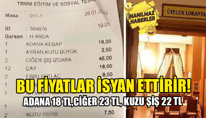 Tartışmalar devam ederken Meclis lokantasının fiyat listesi de çok geçmeden ortaya çıktı. Buna göre TBMM Eğitim ve Sosyal Tesisi’nde Adana kebap 18 TL’den, büyük ayran ise 2,5 TL’den satışa çıkarıldı. 2 porsiyon ciğer şiş ızgaranın 46 TL olduğu Meclis lokantasında 12 bardak çayın toplamda 18 TL’den satılması da dikkat çekti.