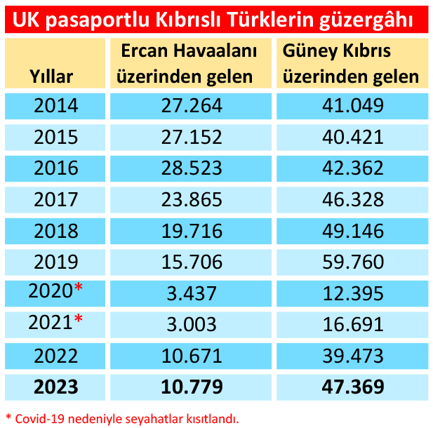 İngiltere’de yaşayan Kıbrıslı Türklerin Kuzey Kıbrıs’a gelmek için Ercan Havalimanı’ndan çok Larnaka ve Baf havalimanlarını kullanıyor. 2023 yılında da İngiltere’de yaşayan Kıbrıslı Türklerin KKTC’nin hava ve deniz limanlarından yaptıkları girişler, Güney’in havaalanları üzerinden gelip, Kuzey’e geçenlerin sayısının çok altında kaldı. Resmi verilere göre, geçen yıl Ercan Havalimanı ve deniz limanlarını kullanan UK pasaportlu Kıbrıslı Türk sayısı 10 bin 779 kişi olurken, Güney’den gelerek, kara kapılarından Kuzey’e geçenlerin sayısı 47 bin 369 kişi düzeyinde kayıtlara geçti.