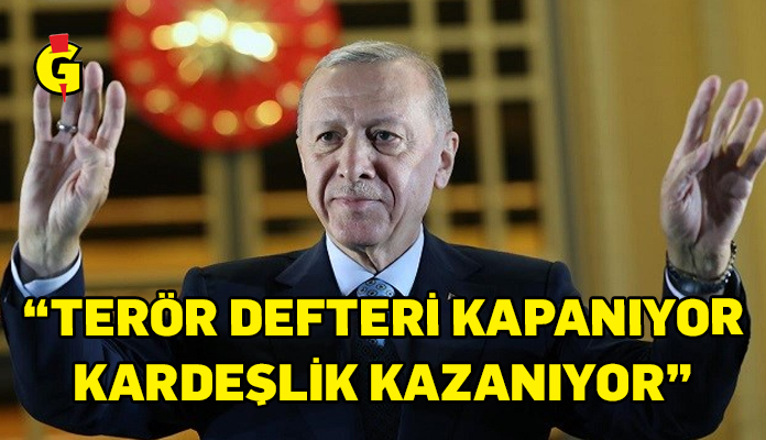 Türkiye Cumhuriyeti Cumhurbaşkanı ve AK Parti Genel Başkanı Recep Tayyip Erdoğan, terör defterinin kapanacağına, kardeşliğin, birlik, beraberlik ve bütünlüğün kazanacağına yürekten inandıklarını vurgulayarak “Şimdi AK Parti, Milliyetçi Hareket Partisi, DEM, biz en azından üçlü olarak bu yola beraber yürümeye kararı verdik” dedi.