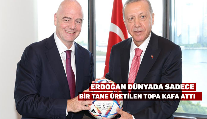 FIFA Başkanı Gianni Infantino ile görüşme gerçekleştiren Türkiye Cumhurbaşkanı Erdoğan, dünyada sadece bir tane üretilen ve kendisine hediye edilen topa kafa atarak danışmanlarına yolladı.