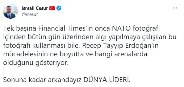 Cumhurbaşkanı ve AK Parti Genel Başkanı Recep Tayyip Erdoğan’ın danışmanlarından İsmail Cesur, Financial Times gazetesine kullandığı bir fotoğraf dolayısıyla tepki gösterdi.