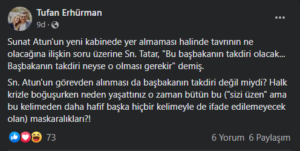CTP Genel Başkanı Tufan Erhürman sosyal medya üzerinden Sunat Atun’un yeni kabinede yer almamasıyla ilgili açıklamada bulundu.