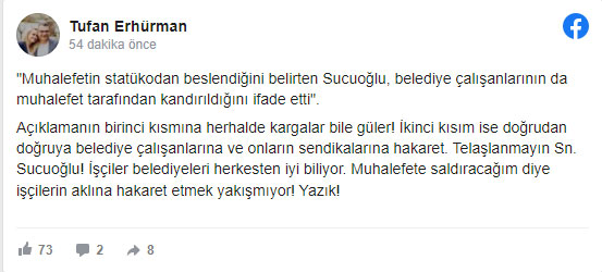 “Telaşlanmayın Sn. Sucuoğlu! İşçiler belediyeleri herkesten iyi biliyor. Muhalefete saldıracağım diye işçilerin aklına hakaret etmek yakışmıyor! Yazık”