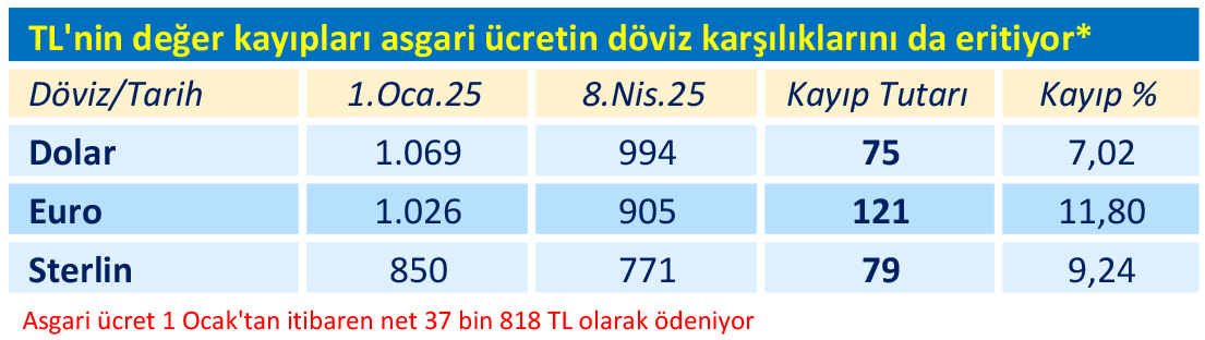 Hükümet yetkililerinin “asgari ücret bin Euro’nun üzerine çıkartıldı” söylemi Mart ayı başları itibarıyla geçerliliğini kaybederken, Euro karşılığı 900’ün dibine kadar geriledi. 8 Nisan itibarıyla net asgari ücretin dövizler karşısındaki kaybı Euro’da %10’un üzerine çıktı. 1 Ocak kurlarıyla “bin 025” (1,026) Euro’ya denk gelen net asgari ücret, 8 Nisan itibarıyla 905 Euro’ya geriledi. 121 Euro eksilen asgari ücretin kaybı %11.8 düzeyinde. Aynı şekilde belirlendiği dönemde bin 069 (1,069) dolara karşılık gelen asgari ücret yüzde 7 kayıpla 996 dolara; 850 sterlinlik karşılığı da yüzde 10 kayıpla 768 sterline indi. Uzmanlar kur ve faizin yanı sıra enflasyonun da yükselme tehlikesi içerisinde olduğuna işaret ederken, asgari ücretin yetersizliğine dikkat çekiyor.