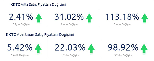 Kuzey Kıbrıs konut piyasasında, “1 metrekare villanın” satış değeri 1,764 (bin 764) sterline; “1 metrekare apartman dairesi satış değeri de 1,225 (bin 225) sterline çıktı. Reidin Data Analytics işbirliğiyle oluşturulan “101evler Emlak Endeksi 2024 Yılı 2. Çeyrek” verilerine göre 90 metrekarelik bir dairenin ortalama fiyatı 110 bin 280 sterline (4 milyon 698 bin TL) yükseldi. 120 metrekarelik bir villanın ortalama fiyatı ise 211 bin 720 sterlin (9 milyon 020 bin TL) olarak hesaplandı.