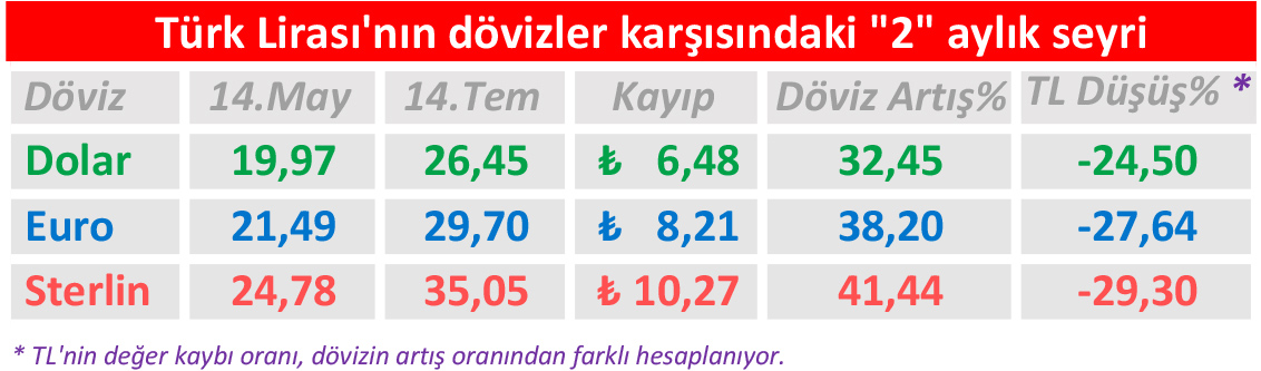 DOLAR… Türkiye’de cumhurbaşkanlığı seçiminin 1’nci turu ile milletvekilliği genel seçimlerinin yapıldığı 14 Mayıs’ta 19.97 olan dolar/TL dün 26.45’e çıkarken, iki aylık sürede artış oranı %32.45 oldu.
