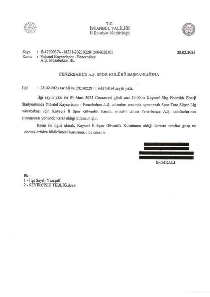 Fenerbahçe Kulübü, Kayseri İl Güvenlik Kurulu’nun hafta sonu Kayserispor ile Fenerbahçe arasında oynanacak maça sarı-lacivertli taraftarların alınmamasına yönelik kararla ilgili yeni bir açıklama yaptı.