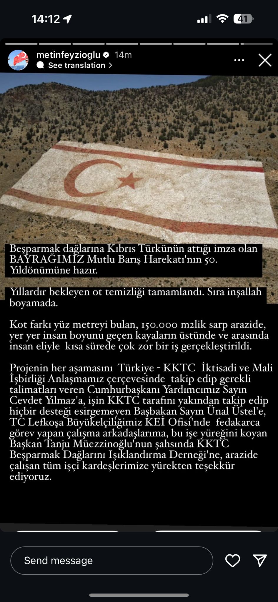 Feyzioğlu’nun paylaşımı şu şekilde: Cumhurbaşkanı başkanı Yardımcımız Sayın Cevdet Yılmaz’a, işin KKTC tarafını yakından takip edip hiçbir desteği esirgemeyen Başbakan Sayın Ünal Üstel’e, TC Lefkoşa Büyükelçiliğimiz KEİ Ofisi’nde fedakarca görev yapan çalışma arkadaşlarıma, bu işe yüreğini koyan Başkan Tanju Müezzinoğlu’nun şahsında KKTC Beşparmak Dağlarını Işıklandırma Derneği’ne, arazide çalışan tüm işçi kardeşlerimize yürekten teşekkür ediyoruz.