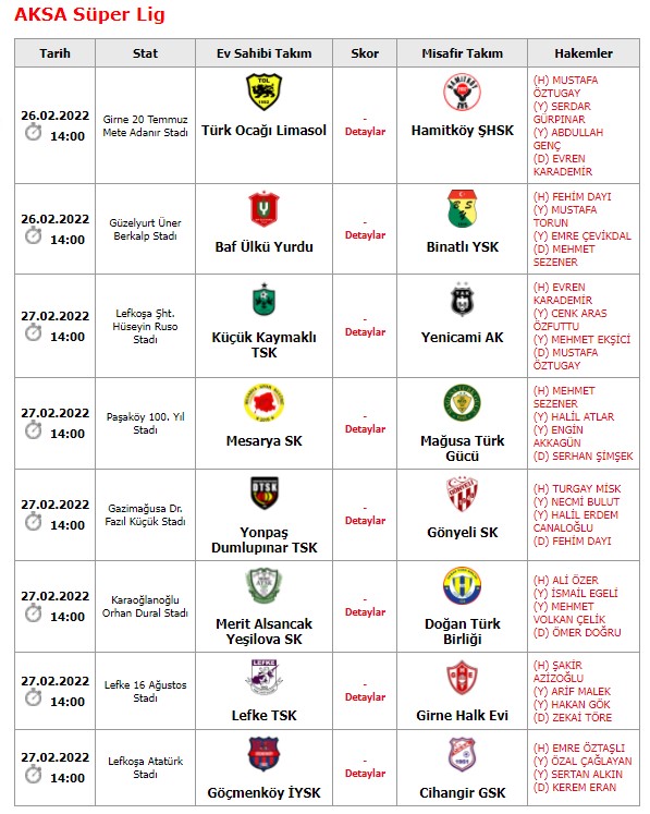 Kıbrıs Türk Futbol Federasyonu (KTFF) tarafından organize edilen AKSA Süper Lig, AKSA 1.Lig ve AKSA A2 Ligleri'nde 20.hafta programı belli oldu.
