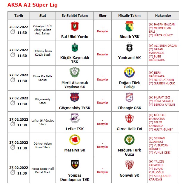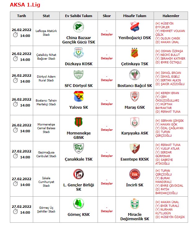 Kıbrıs Türk Futbol Federasyonu (KTFF) tarafından organize edilen AKSA Süper Lig, AKSA 1.Lig ve AKSA A2 Ligleri’nde 20.hafta programı belli oldu.