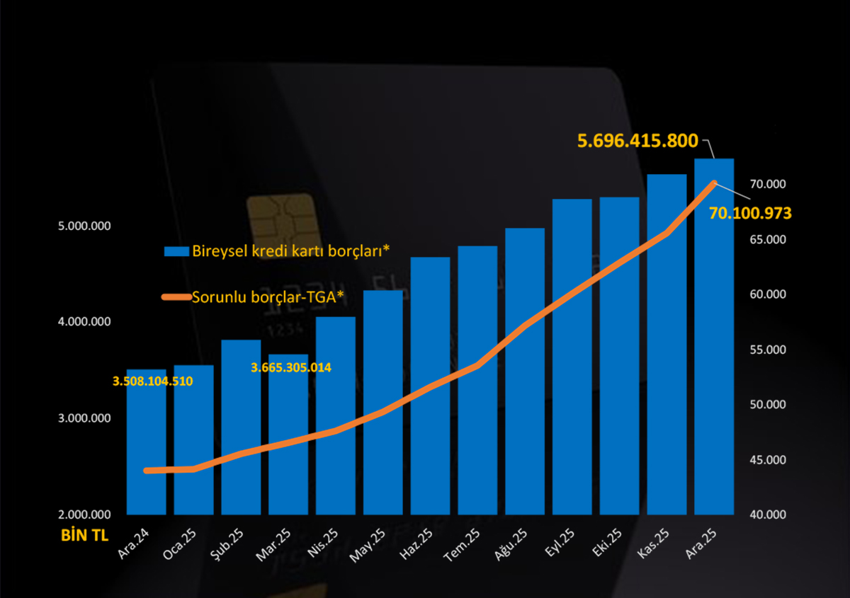 Merkez Bankası Risk Merkezi verilerine göre vatandaşın kredi kartı borcu Aralık 2025 sonunda 5,6 milyar liranın üzerindeki miktarla tüm zamanların zirvesine çıkarken, ödenemeyip mahkemelik olan borçlar da (tahsili gecikmiş alacaklar TGA) rekor seviyeye ulaştı. Bireysel kredi kartı borçlarında 2024 yılını 44 milyon 029 bin liradan kapatan TGA’nın 2025 yılı sonunda %59.2 artışla 70 milyon 100 bin liraya çıktığı hesaplandı. Bireysel borçlarda yıllarca 33-38 milyon bandında hareket eden TGA’nın son iki yılda 70 milyon lirayı aşması özellikle dikkati çekti. “Kurumsal” kredi kartı borçlarındaki TGA ise %55.4 artışla 6 milyon 314 bin TL’den, 9 milyon 814 bin TL’ye yükseldi.