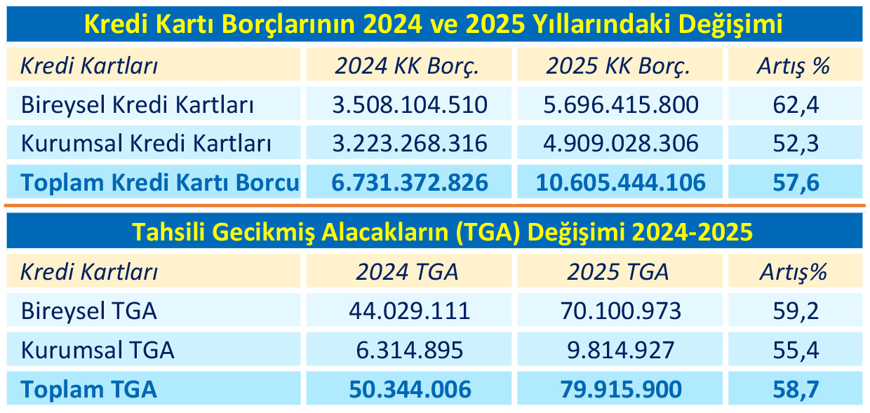 KKTC Merkez Bankası verilerine göre, 2025 yılında bireysel kredi kartı borçları %62.4 oranında büyüdü. Aralık 2024’te 3 milyar 508 milyon TL düzeyinde olan bireysel kredi kartı borçları, bir yıllık sürede 2 milyar 188 milyon lira artarak 5 milyar 596 milyon TL’ye ulaştı. Kurumsal kredi kartı borçları ise yılı 4 milyar 909 milyon TL’den kapatırken, tüm kredi kartı borçlarının toplamı da 10 milyar 605 milyon TL’ye ulaştı. Eylül 2024’te 3 milyar lirayı aşan “bireysel” kredi kartı borçları; geçtiğimiz yılın Nisan ayında 4 milyar lirayı, Eylül ayında da 5 milyar lirayı aştı.