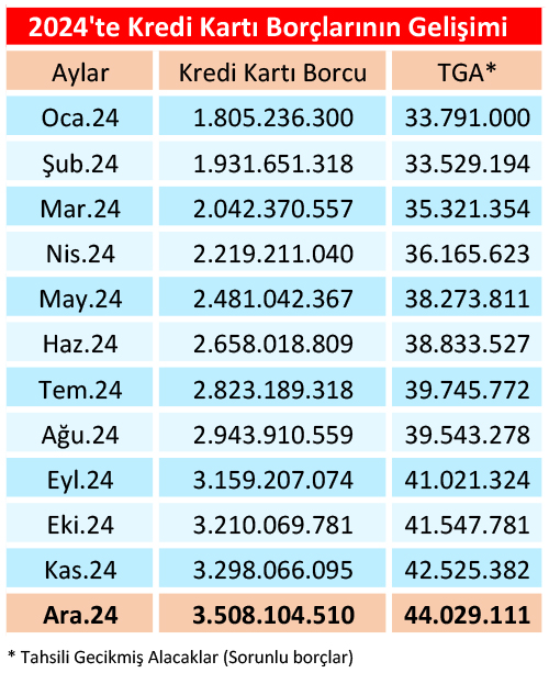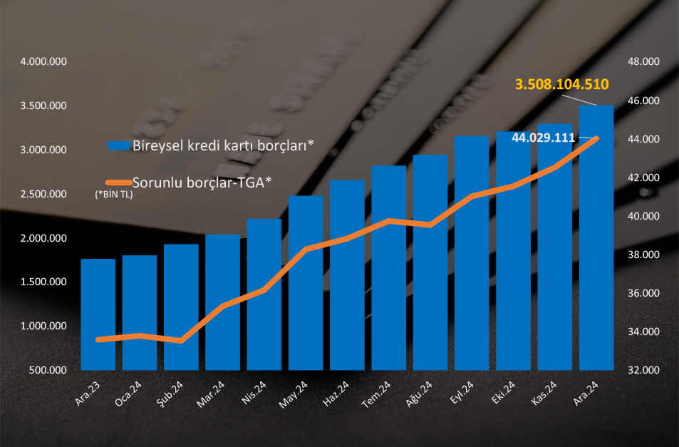 Risk Merkezi verilerine göre vatandaşın kredi kartı borcu Aralık 2024 sonunda 3,5 milyar liranın üzerindeki miktarla tüm zamanların zirvesine çıktı. Mart ayında ilk kez 2 milyar sınırını aşan kart borçları, tüm yıl boyunca artışını hız vermeden sürdürdü. Özellikle Mayıs’taki %11.8’lik artış dikkati çekti. Kredi kartı borçlarındaki tahsili gecikmiş alacakların (TGA) ise %31.1 artışla 33,5 milyon TL’den 44 milyon TL’ye uçtuğu saptandı. Yıllarca 33-38 milyon bandında hareket eden TGA’nın artışı dikkati çekti.