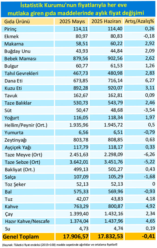 karşılaştırmalı fiyatları, Mayıs’ta gıdaya yapılması gereken 17 bin 907 liralık harcamanın, Haziran’da 17 bin