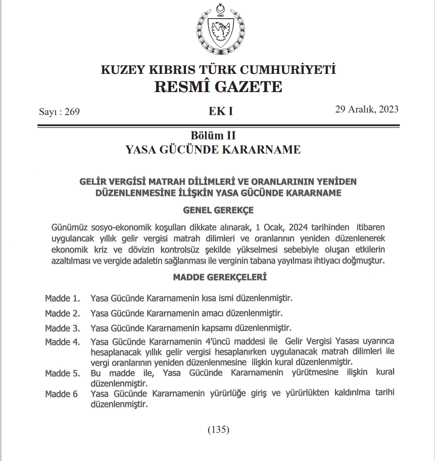 Cuma günkü Resmi Gazete’de yer alan Yasa Gücünde Kararname’nin genel gerekçesinde, “Günümüz sosyo-ekonomik koşulları dikkate alınarak, 1 Ocak 2024 tarihinden itibaren uygulanacak yıllık gelir vergisi matrah dilimleri ve oranlarının yeniden düzenlenerek ekonomik kriz ve dövizin kontrolsüz şekilde yükselmesi sebebiyle oluşan etkilerin azaltılması ve vergide adaletin sağlanması ile verginin tabana yayılması ihtiyacı doğmuştur” ifadeleri kullanıldı.
