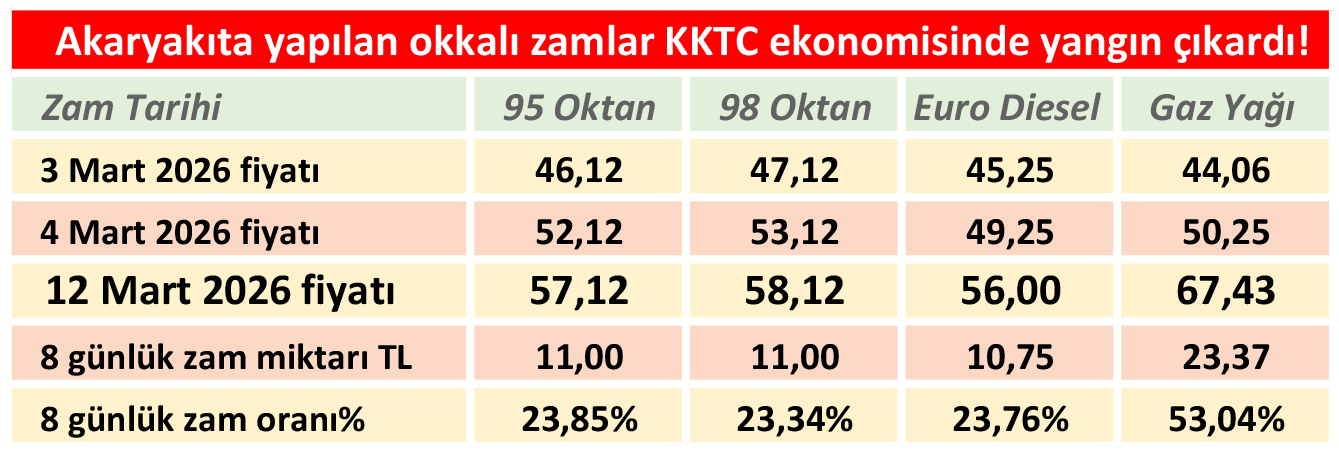 KKTC’de akaryakıt fiyatlarına kısa süre içinde yapılan iki ayrı zam, ekonomide yeni bir maliyet ve dolayısıyla zam dalgasının kapısını araladı. Sadece 8 gün içinde litre başına yaklaşık 12 TL artan akaryakıt fiyatlarında 95 oktan benzine %23.85, 98 oktan benzine %23.34, Eurodizel’e %23.76 ve gaz yağına ise %53.04 oranında zam yapıldı. Akaryakıta yapılan zamların, ülke ekonomisi için sadece bir maliyet artışı değil, aynı zamanda ciddi bir “enflasyon şoku” niteliğinde olduğunu anlatan ekonomistler, enflasyonun kısa sürede iyice uçacağına işaret ediyor.