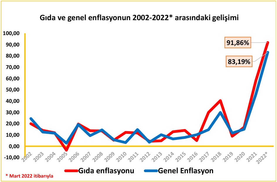 Gıda enflasyonu Mart ayında çıktığı %91.86 oranıyla 1990’lı yıllardan bu yana en yüksek seviyesine uçtu